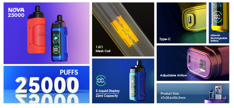 25000 سحبة. بفضل تصميمها الأنيق والمريح، وسعتها الكبيرة من السائل (22ml)، تمنحك نكهات قوية ومرضية من أول سحبة إلى آخرها.